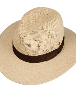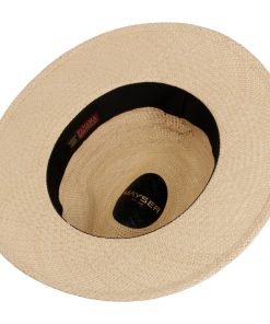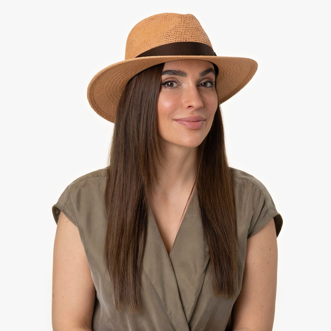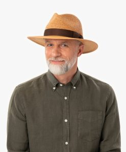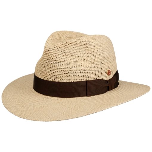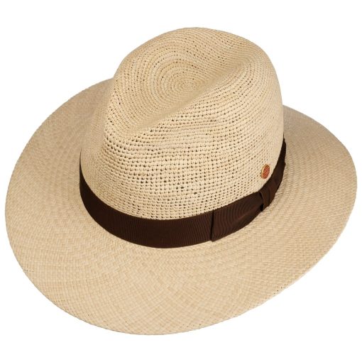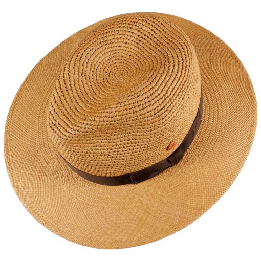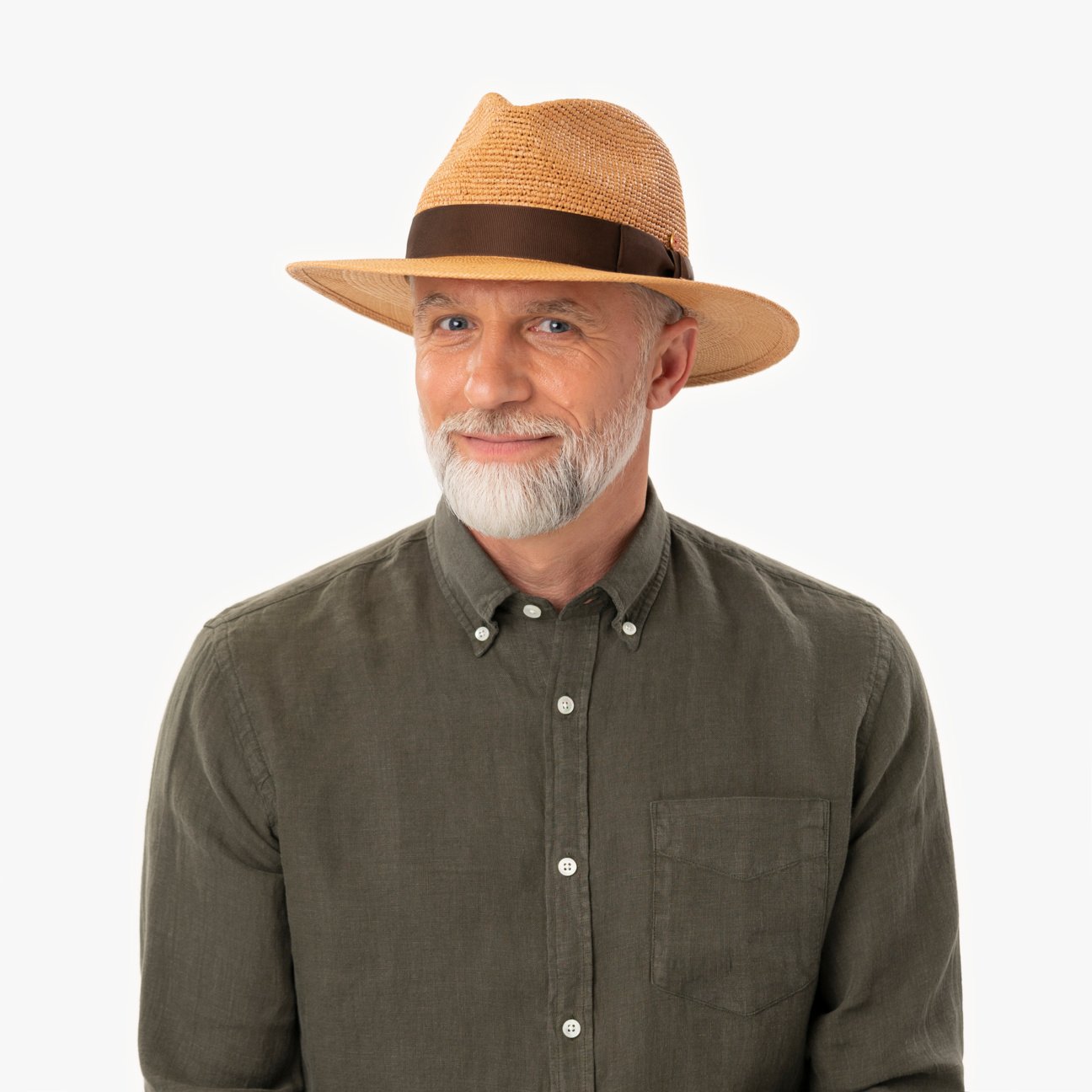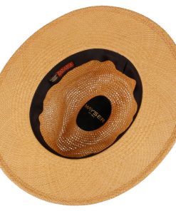 Ein exquisiter Herrenhut, gefertigt aus feinem Panamastroh, punktet mit seiner Leichtigkeit und Flexibilität. Besondere Aufmerksamkeit erregt die sorgsam gewebte Krempe sowie die gehäkelte Kopfkrone aus Toquilla-Stroh. Eine stilvolle Ripsbandgarnitur samt unaufdringlicher Schleife und geprägtem Metallemblem verleiht dem Hut einen eleganten Touch. Für zusätzlichen Komfort sorgt das breite Ripsfutterband am Innenrand des Hutes.