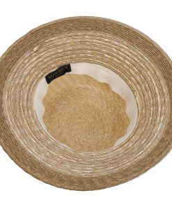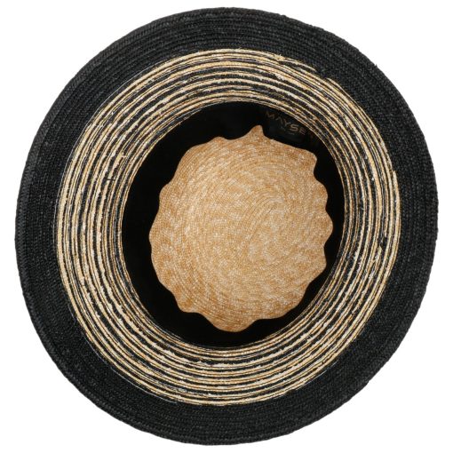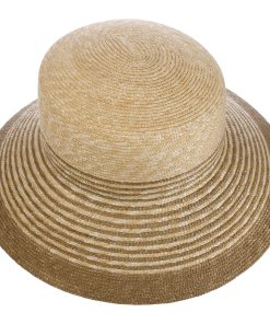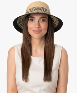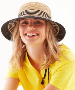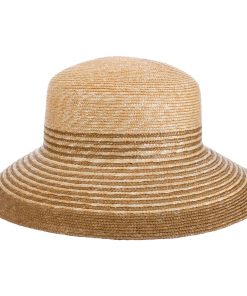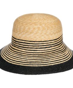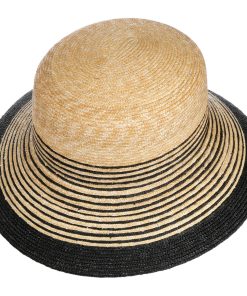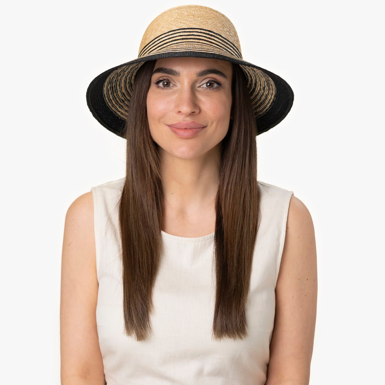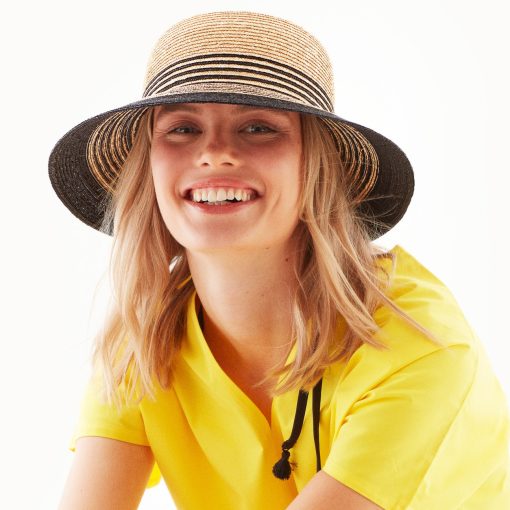 Der handgefertigte Glockenhut zeichnet sich durch seine geschwungene Form und abfallende Krempe aus, die durch ein Streifendesign hervorgehoben wird. Dies verleiht dem Hut eine weibliche Note. Der leichte Strohhut ist mit flexiblen Borten geflochten und bietet dank des Stretchfutterbands sowie integrierten UV-Filters zusätzlichen Komfort. Ob auf Reisen, in der Freizeit oder bei Gartenpartys – er zieht immer alle Blicke auf sich und sorgt für einen stilvollen Auftritt. Hergestellt wurde das Modell in der Slowakei.