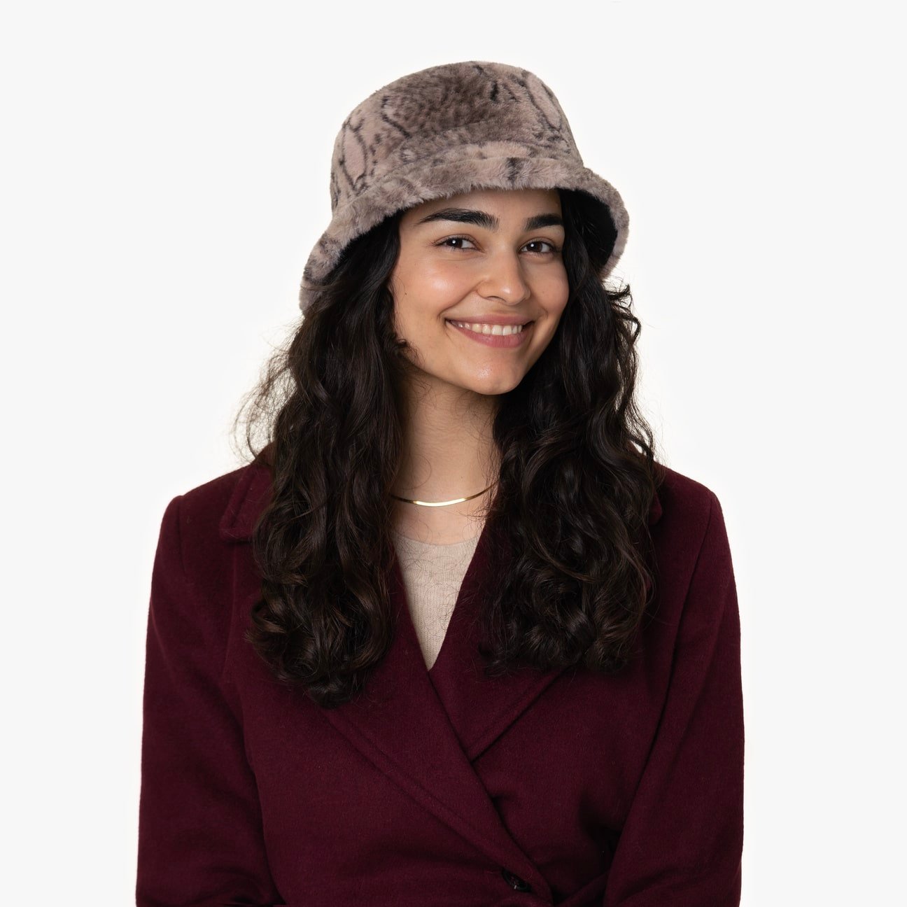 Mit seinem flauschigen Design ist der Bucket Hat perfekt, um auch an kühlen Tagen im Freien wohlige Wärme zu genießen. Sein weicher Materialmix und das Futter aus reiner Baumwolle sorgen für ein angenehmes Tragegefühl und behagliche Kopfwärme. Ein Stretchfutterband garantiert zudem eine ausgezeichnete Passform bei diesem eleganten Stoffhut mit luxuriösem Tiermuster in sanftem Roséton. Hergestellt wird er in der EU.