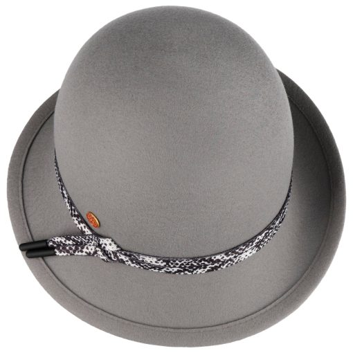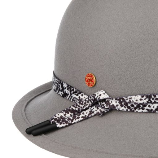 Mit seiner eleganten und modischen Ausstrahlung, ist dieser Glockenhut aus Wollfilz ein feminines Highlight. Seine runde Krone kombiniert mit einer asymmetrisch geformten Krempe verleiht jedem Outfit das gewisse Etwas. Das einfarbige Design wird durch ein gemustertes Garniturband abgerundet, welches doppelt um die Krone geschlungen und lässig zusammengebunden wurde. Für den perfekten Halt sorgt zudem das integrierte Stretchfutterband. Ein in der EU hergestelltes Produkt von hoher Qualität.